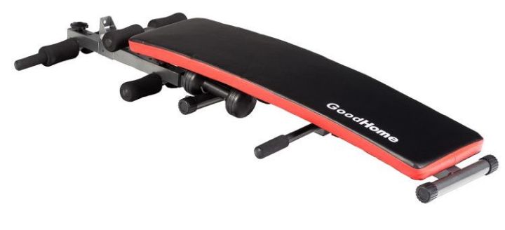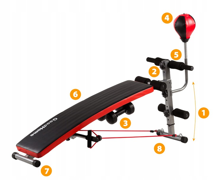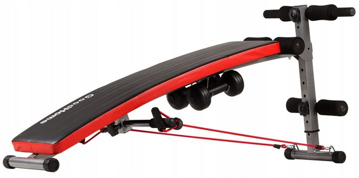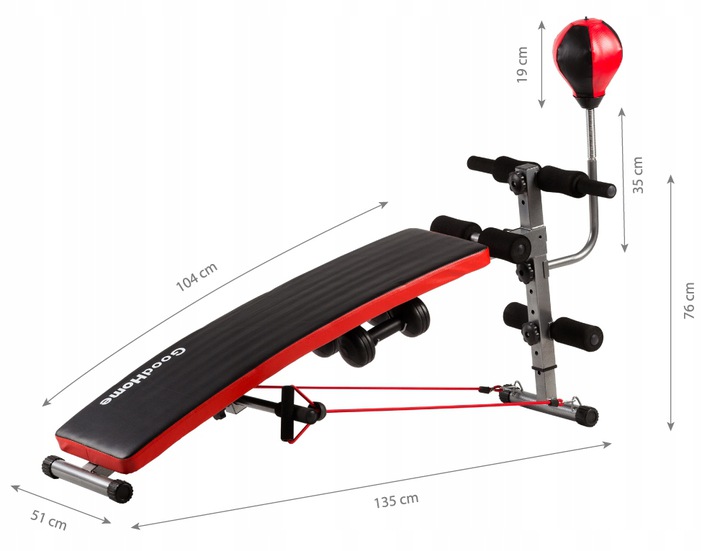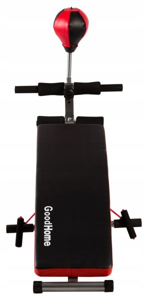 Ławkę GoodHome charakteryzję masywna, stabilna konstrukcja malowana proszkowo. Podczas cwiczeń wygodę zapewnia siedzisko z oparciem wykonane z wysokiej jakości eko-skóry wypełnione miękką pianką. Ławeczka posiada 5 stopniową regulację wysokości oraz 2 stopniową regulację popadcia dla kolan. Dodatkowo w zestawie znajdują się elastyczne linki, dwie hantle oraz gruszka do boksu.