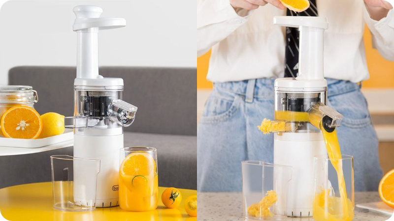 Electric Juicer B to wolnoobrotowa wyciskarka soków. Niska prędkość obrotowa zmniejsza utlenianie wyciskanych płynów, pomaga też zachować więcej wartości odżywczych. Sok jest automatycznie oddzielany od miąższu, który wędruje do osobnego pojemnika. Kompaktowa konstrukcja urządzenia ułatwia transport i przechowywanie. Wysokość jedynie 35,5cm i średnica 9,25 cm sprawią, że na to urządzeni bez problemu znajdziesz miejsce w kuchni.