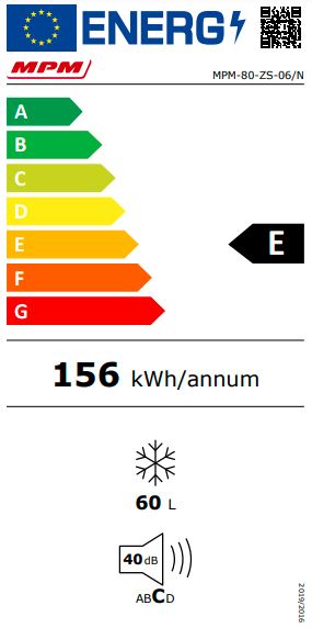 Zamrażarka MPM-80-ZS-06/N pracuje w klasie energetycznej E, co oznacza wysoką efektywność i niskie zużycie energii elektrycznej. Jedyne 156 kWh w ciągu roku.