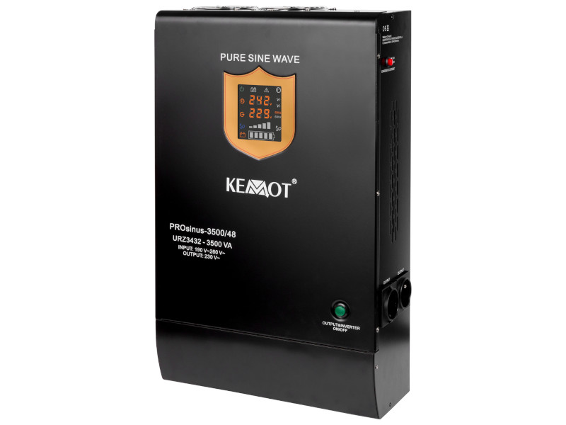 Zasilacz awaryjny KEMOT PROsinus-3500/48 URZ3432 to zaawansowane rozwiązanie UPS (Uninterruptible Power Supply) o mocy wyjściowej 3500 W, przeznaczone do zapewnienia stabilnego zasilania w przypadku awarii prądu. Wyposażony w technologię czystej sinusoidy, zasilacz gwarantuje bezpieczne i niezawodne działanie urządzeń wymagających precyzyjnego zasilania, takich jak piece CO, pompy, komputery, serwery, sprzęt RTV, AGD czy systemy alarmowe. Dzięki temu KEMOT PROsinus-3500/48 URZ3432 idealnie sprawdza się zarówno w domach, jak i w firmach, dbając o ciągłość pracy kluczowych urządzeń podczas przerw w dostawie energii. Zasilacz współpracuje z akumulatorami 48V, co pozwala na dostosowanie czasu podtrzymania do indywidualnych potrzeb. Wbudowany wyświetlacz LCD umożliwia wygodne monitorowanie parametrów pracy, takich jak stan baterii, napięcie wejściowe i wyjściowe. KEMOT PROsinus-3500/48 URZ3432 oferuje również zaawansowane zabezpieczenia przed przeciążeniami, przepięciami oraz przegrzaniem, co chroni podłączone urządzenia przed uszkodzeniami. Solidna konstrukcja i wysoka wydajność sprawiają, że jest to niezawodny zasilacz awaryjny, zapewniający spokój i bezpieczeństwo w każdych warunkach.