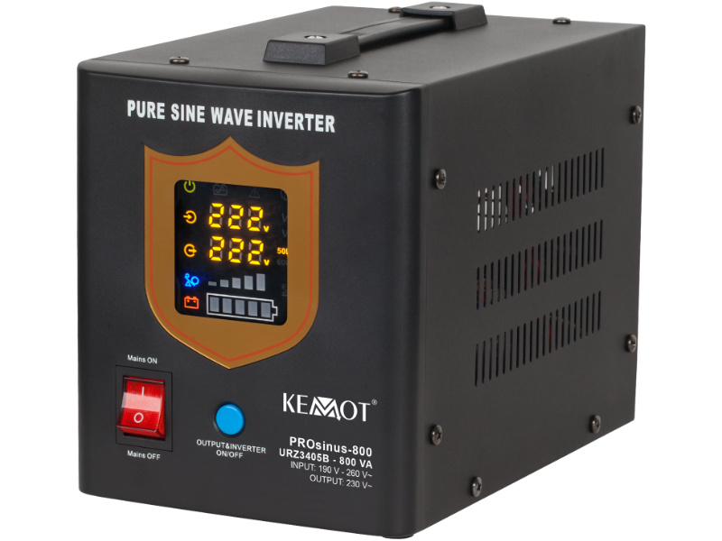 Zasilacz awaryjny KEMOT to urządzenie mające na celu podtrzymać zasilanie w podłączonych do niego sprzętach w przypadku awarii sieci energetycznej. Zastosowanie znajdzie w serwerowniach i biurach, a także w domach prywatnych. Przetwornica KEMOT z czystym przebiegiem sinusoidalnym przeznaczona jest do awaryjnego zasilania takich urządzeń jak piec centralnego ogrzewania, pompy ciepła, telewizor, lodówka, itp. Urządzenie KEMOT może pracować nie tylko w trybie zasilacza awaryjnego, lecz także jako prostownik doładowujący akumulator zewnętrzny, oraz przetwornica, która przetwarza napięcie stałe 12V DC na zmiennie 230V AC.