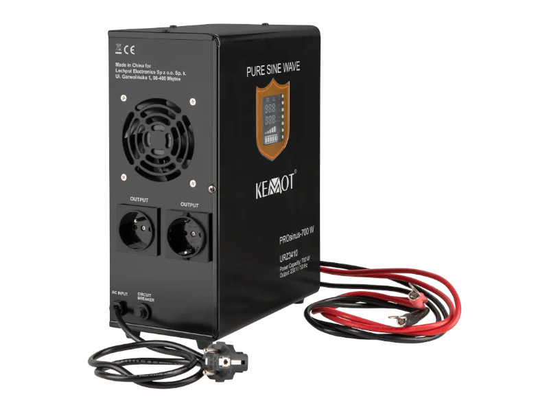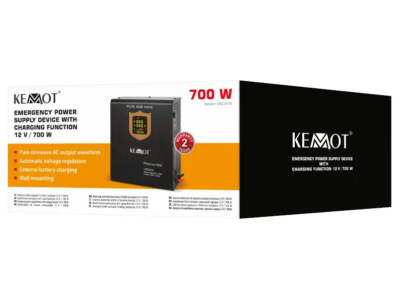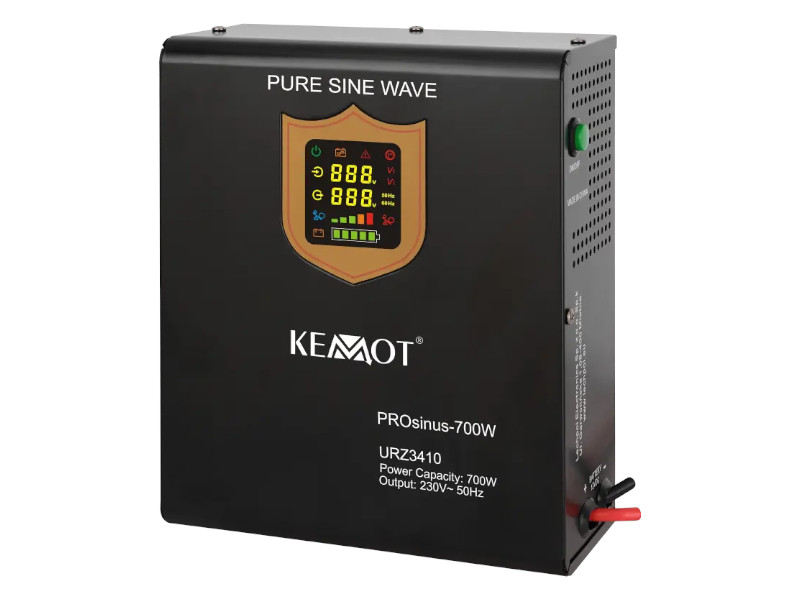 Zasilacz awaryjny KEMOT to urządzenie mające na celu podtrzymać zasilanie w podłączonych do niego sprzętach w przypadku awarii sieci energetycznej. Zastosowanie znajdzie w serwerowniach i biurach, a także w domach prywatnych. Przetwornica KEMOT z czystym przebiegiem sinusoidalnym przeznaczona jest do awaryjnego zasilania takich urządzeń jak piec centralnego ogrzewania, pompy ciepła, telewizor, lodówka, itp.