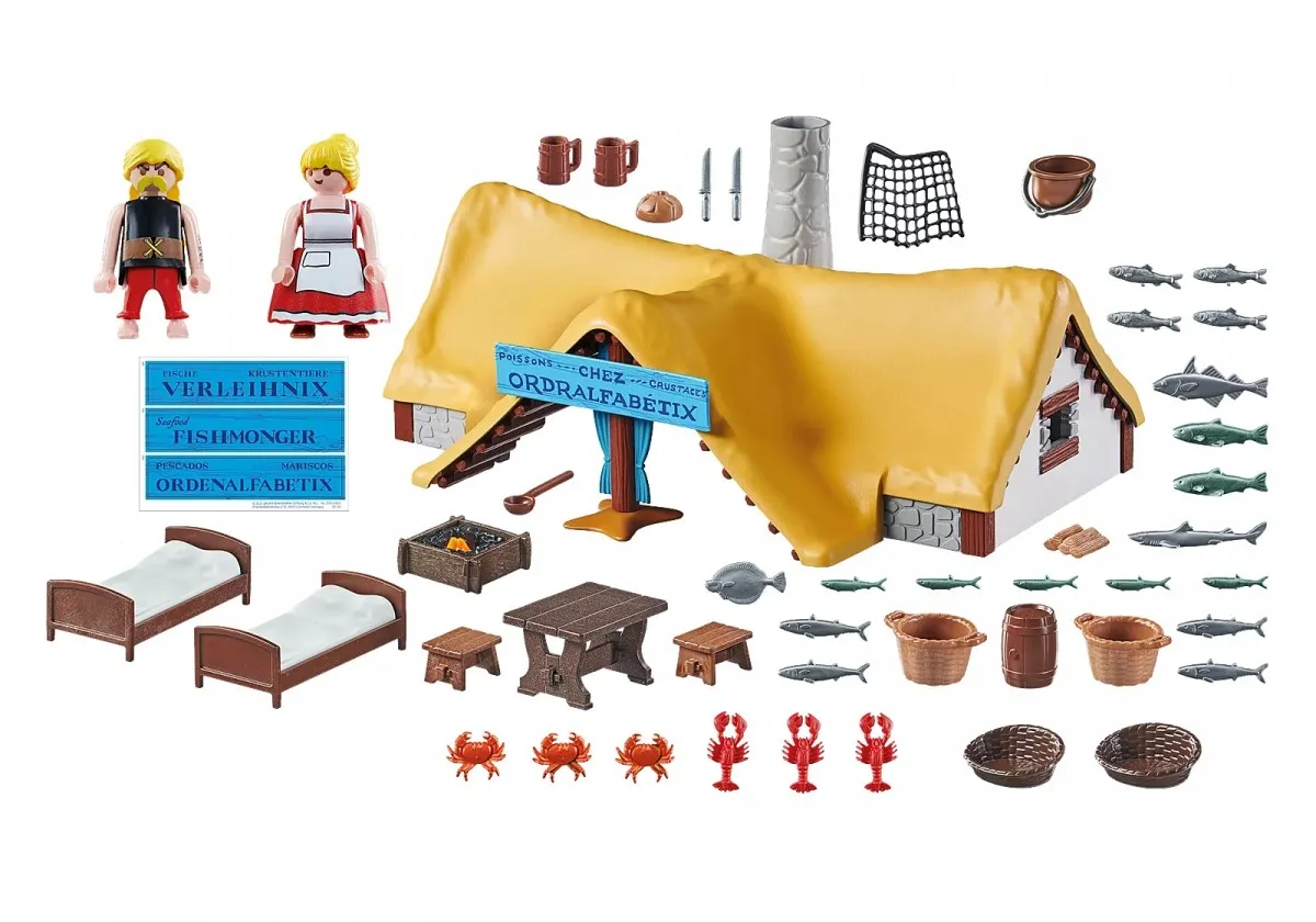 - 73-częściowy zestaw zabawek Asterix zawiera 2 figurki PLAYMOBIL handlarza rybami Unhygienixa i jego żony Bakterii, chatę Unhygienixa, dwa łóżka, stół, taboret, kominek, kosze, ryby i owoce morza na sprzedaż oraz inne meble. Dach chatki można częściowo otworzyć do zabawy.