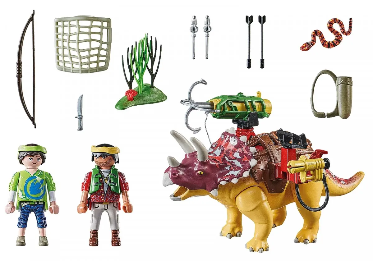 - Zestaw zabawek zawiera Milowa, bohatera Dino Rise i inną figurkę PLAYMOBIL, triceratopsa ze zbroją na plecach, armatami i pociskiem z hakiem, a także łuk i strzały oraz inne dodatki przypominające dino.