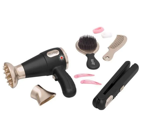 - Wiele opcji zabawy jest tu wszystko, czego potrzebuje początkujący stylista fryzur: suszarka, wymienne końcówki do suszarki, prostownica, szczotka, grzebień, spinki i gumki do włosów.