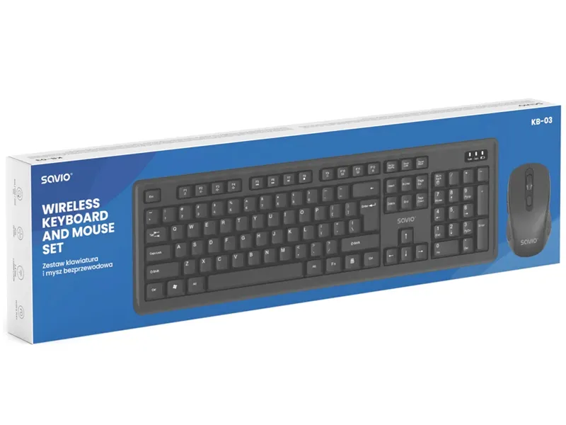 Zestaw bezprzewodowy Savio KB-03 to komplet do wygodnej, uporządkowanej pracy w domu i biurze. Pełnowymiarowa klawiatura w układzie US (amerykański układ klawiszy, 104 przyciski) zapewnia ciche, płynne pisanie nawet przez wiele godzin, a ergonomiczna mysz dobrze leży w dłoni i pozwala dopasować precyzję ruchu do Twoich preferencji. Oba urządzenia łączą się z komputerem przez odbiornik USB (Universal Serial Bus — uniwersalny port komunikacyjny), zapewniając stabilne połączenie bez kabli.