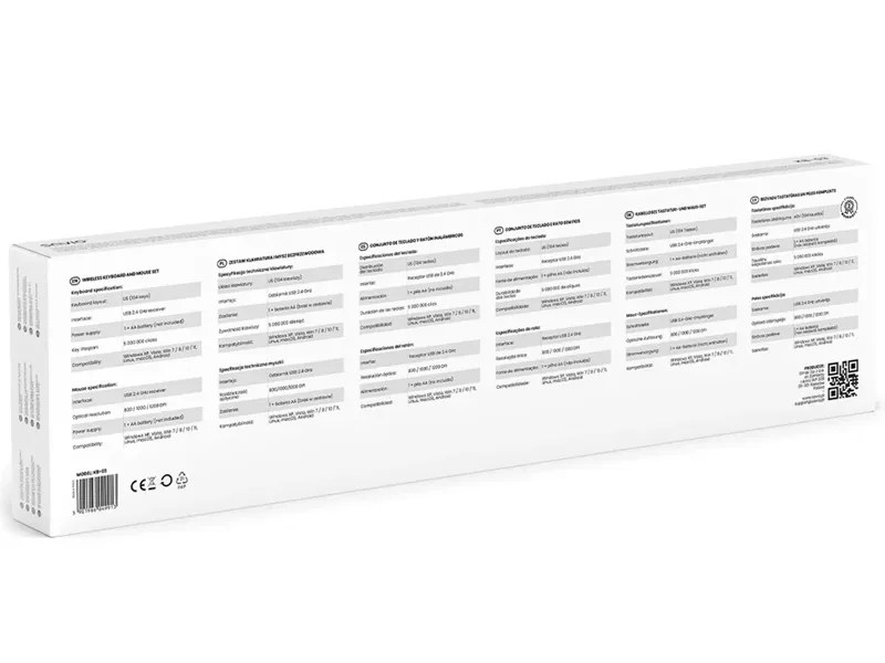 Zestaw działa w trybie Plug & Play (bez instalacji dodatkowych sterowników). Wystarczy umieścić odbiornik USB w porcie komputera, włożyć baterie AA (nie są dołączone do zestawu) i można pracować od razu. KB-03 jest kompatybilny z systemami Windows XP/Vista/7/8/10/11, Linux, macOS oraz Android, więc bez problemu wpasuje się w Twoje środowisko.