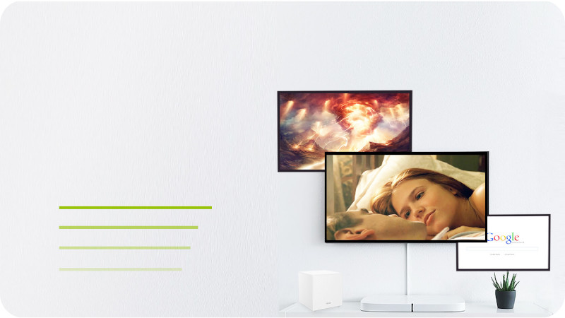 Trójzakresowe rozwiązanie AC2100 Mesh wykorzystuje pełny potencjał łącza światłowodowego. Trzy pasma (2,4 GHz, 5 GHz-1 i 5 GHz-2) są używane jako backhaul, aby wyeliminować opóźnienie podczas jednoczesnego strumieniowania z wielu urządzeń.