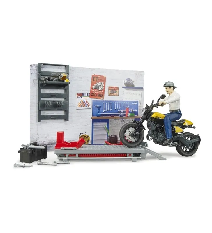 Warsztat motocyklowy z motocyklem Ducati i figurką mechanika marki BRUDER (62102) to idealny prezent dla fana motorów. Dziecko w zestawie znajdzie makietę warsztatu - ścianę, na której zamontowana jest półka z niezbędnymi akcesoriami. Najważniejszym elementem jest z pewnością platforma do podnoszenia motocykla. Można ją opuszczać i podnosić wedle upodobania. Mechanik posiada niezbędne narzędzia do pracy, zamknięte w skrzynce. Za ich pomocą, umieszczając motocykl na platformie można dokręcić koła motocykla.