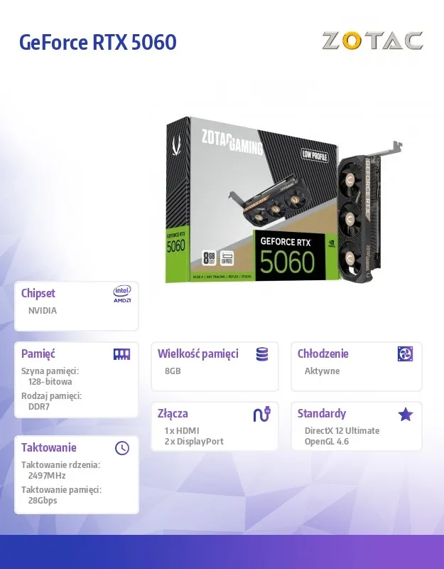 Komputery i podzespołyPodzespołyKarty graficzneZOTAC Karta graficzna GeForce RTX 5060 LP 8GB GDDR7 128bit 2DP/HDMI