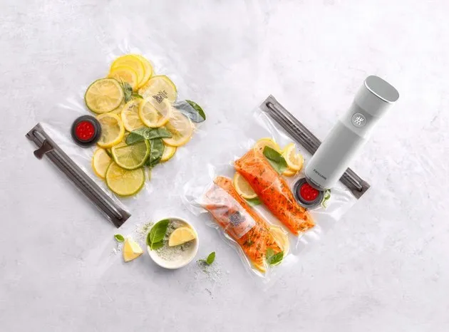 Od tego momentu pracę wykona za nas pompa próżniowa (do zakupienia osobno), którą wystarczy umieścić w zaworze i nacisnąć przycisk, za sprawą którego usunięte zostanie całe powietrze. Aby bezpiecznie zamknąć torebkę, należy nacisnąć środkowy przycisk znajdujący się obok czerwonego zaworu, który zagwarantuje bezpieczeństwo oraz zachowanie wszelkich wartości odżywczych oraz aromatów. Spakowana w ten sposób żywność zachowuje swoją świeżość nawet pięć razy dłużej! Jest to efekt, jakiego nie może zagwarantować nawet najlepsza zamrażarka. Na dodatkową uwagę zasługuje tutaj innowacyjny sposób marynowania, który dzięki dołączonej specjalnej nasadce jest nie tylko dziecinnie prosty, ale przede wszystkim dużo szybszy. Mało tego! Aby nigdy nie zapomnieć o zapakowanej żywności, wystarczy skorzystać z bezpłatnej aplikacji ZWILLING, zeskanować znajdujący się na torbie kod QR i wprowadzić kilka danych - gdy tylko nadejdzie czas spożycia, otrzymasz powiadomienie. A dzięki indywidualnym identyfikatorom na workach nie pomylisz nawet najbardziej podobnych produktów.